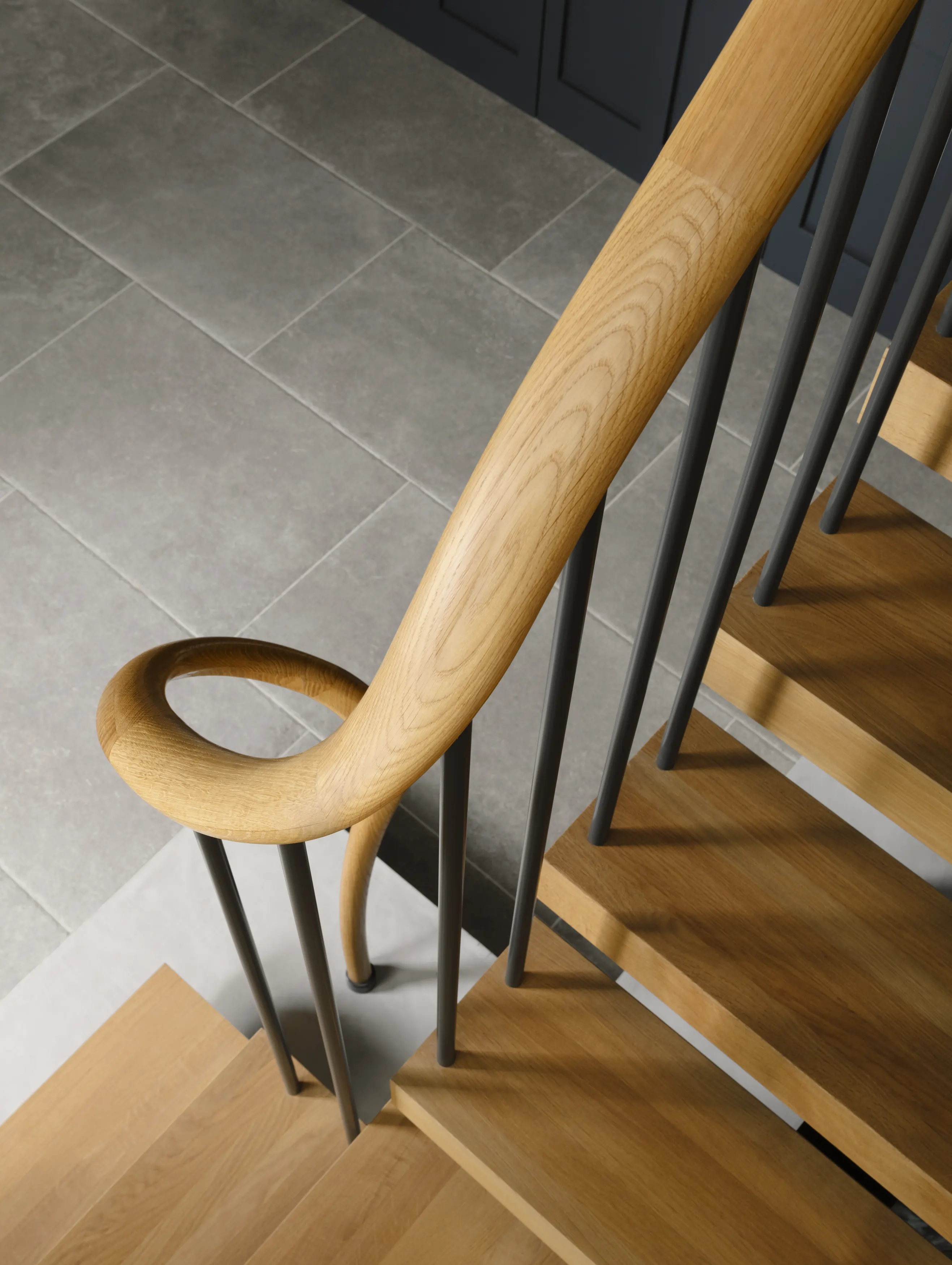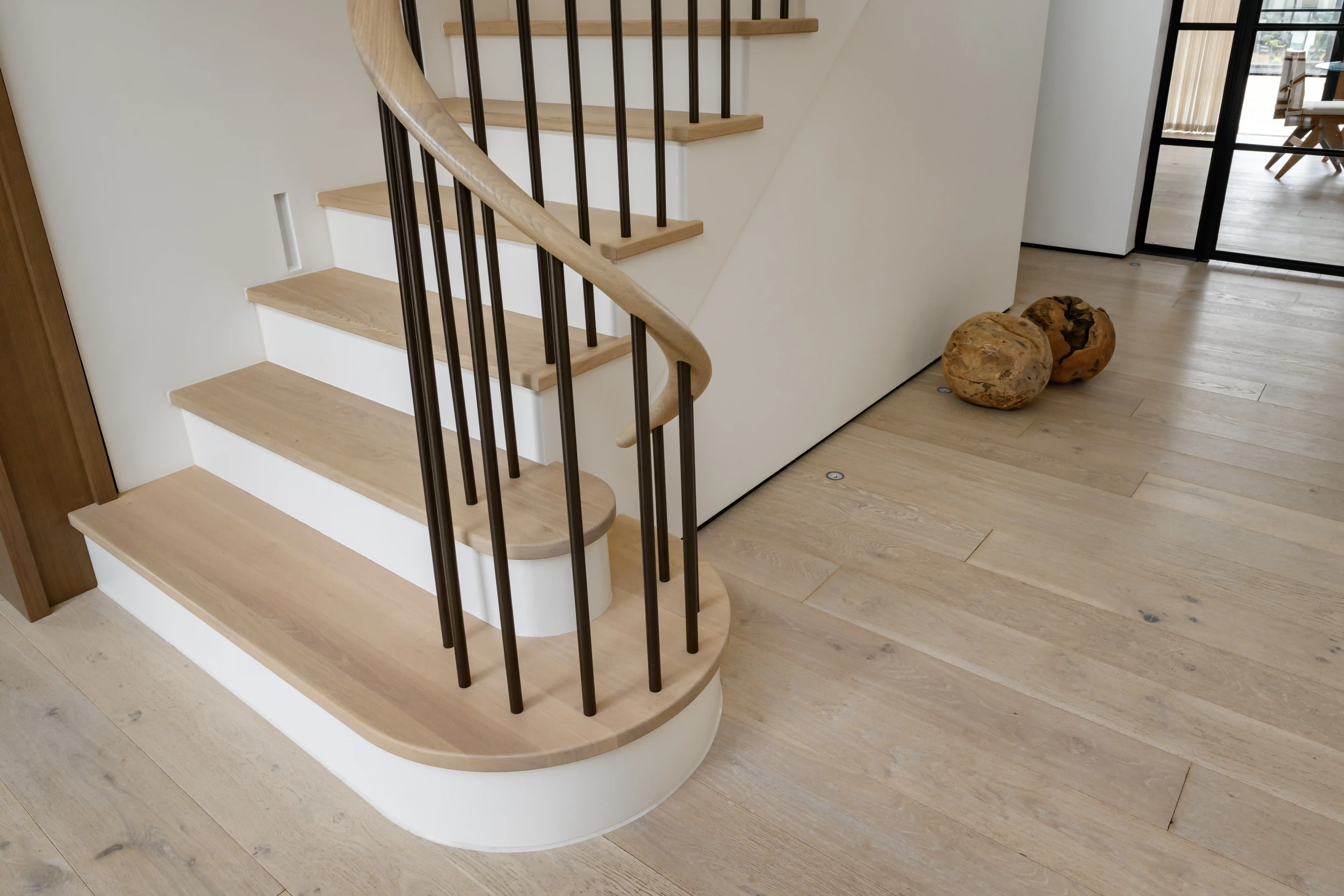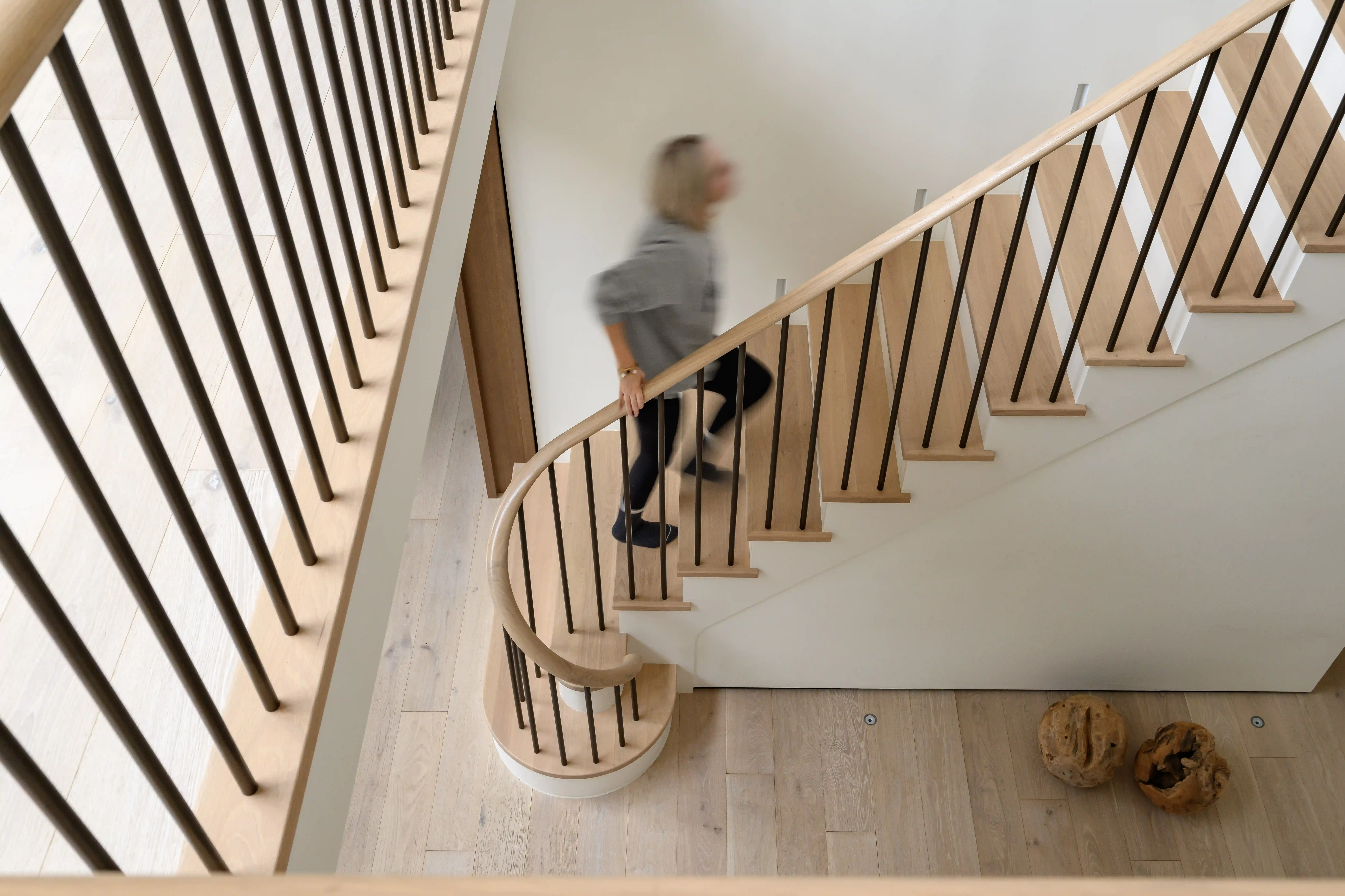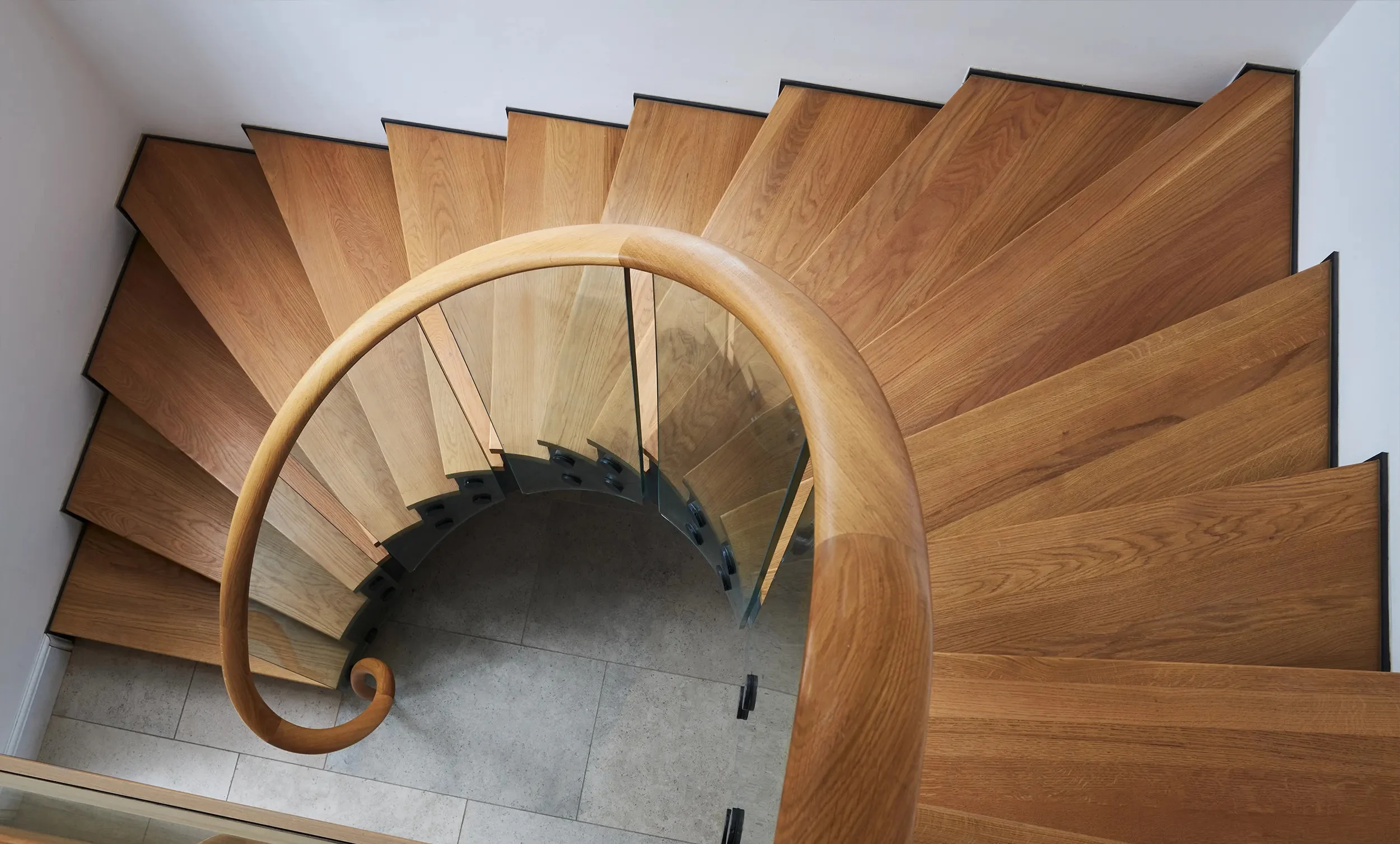 More architectural or multi-floor curved staircases featuring continuous curved handrails create a sense of movement and complexity. Even the untrained eye quickly appreciates the level of craftsmanship required for a millimetre-perfect spiralling timber handrail.