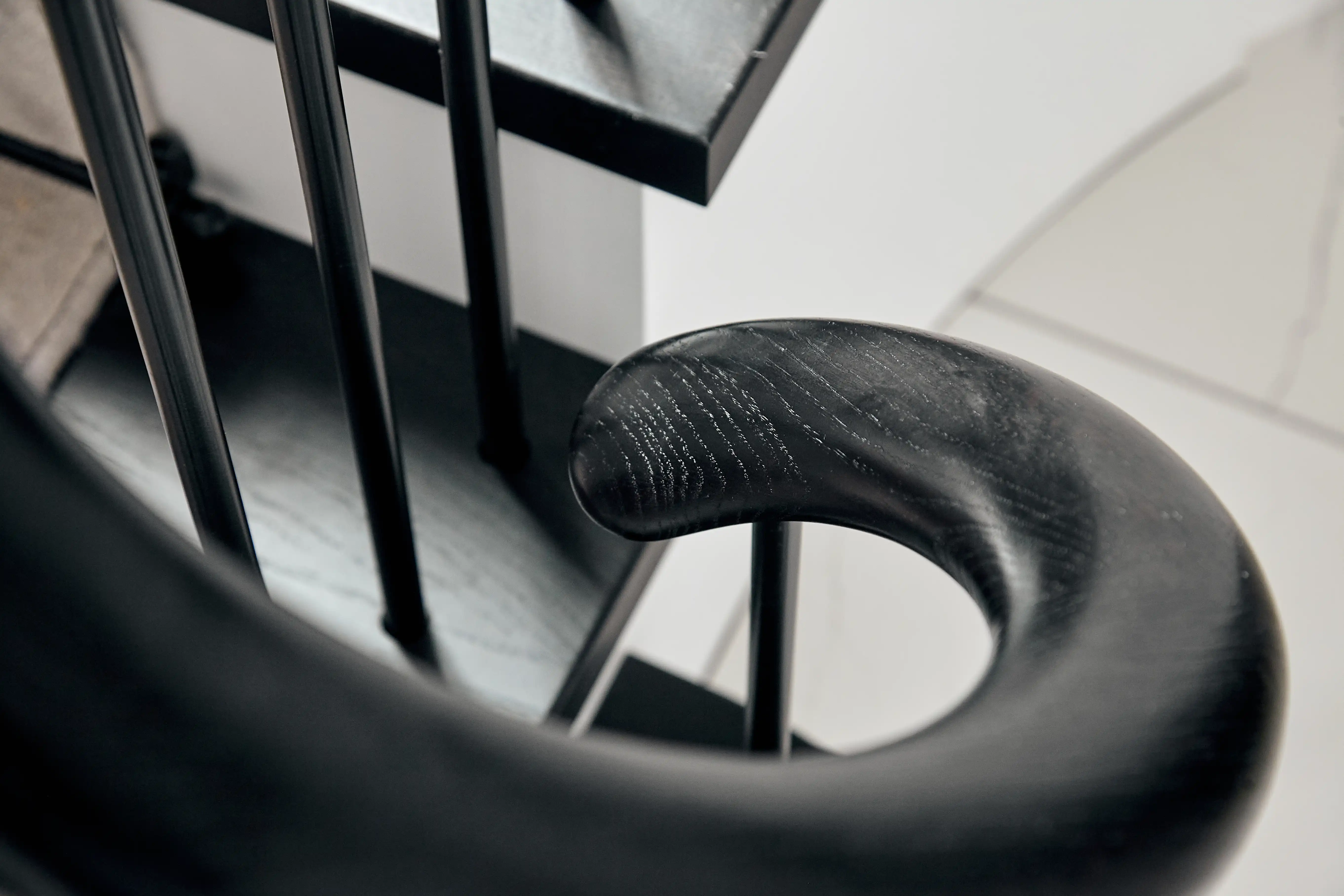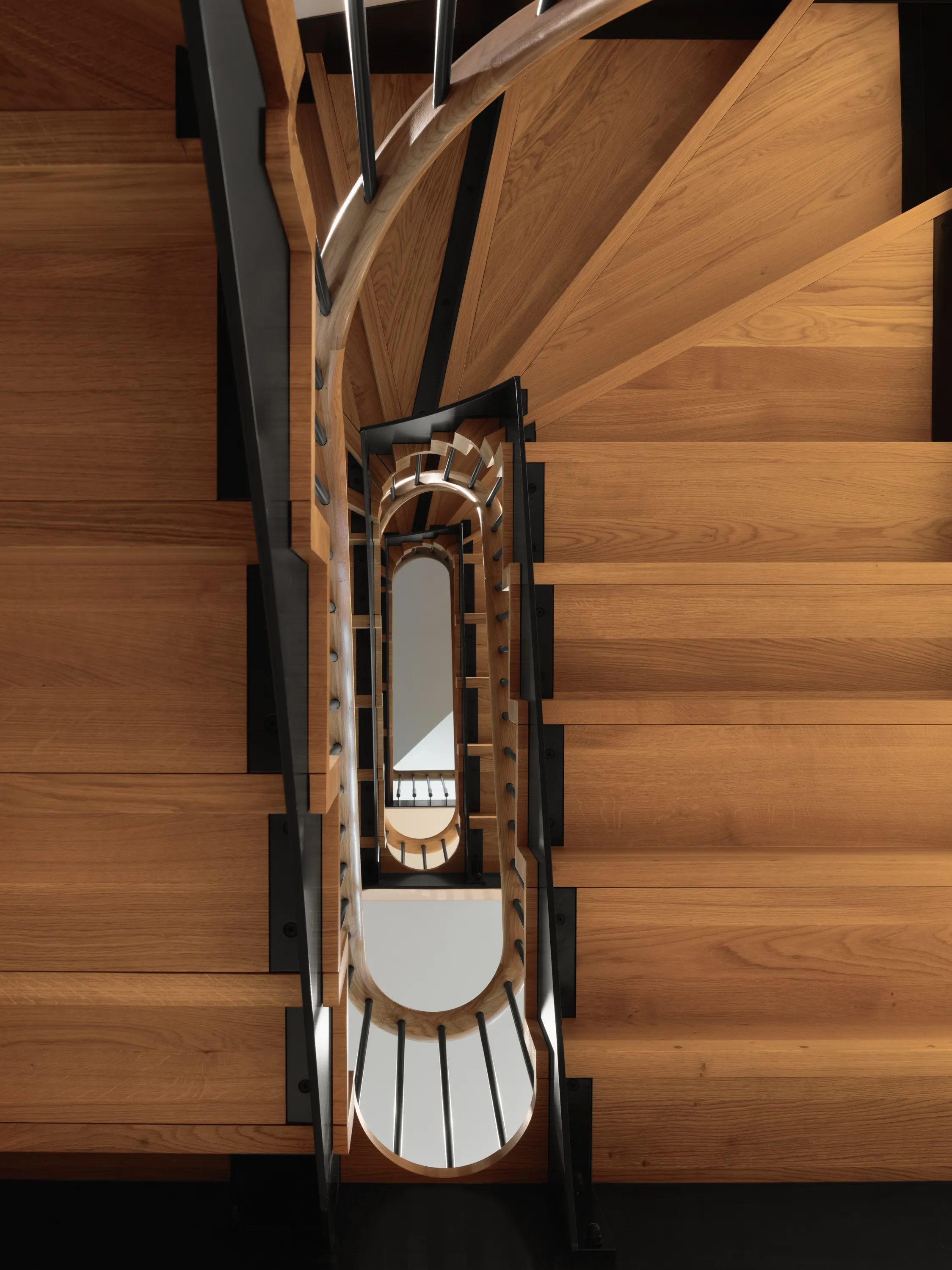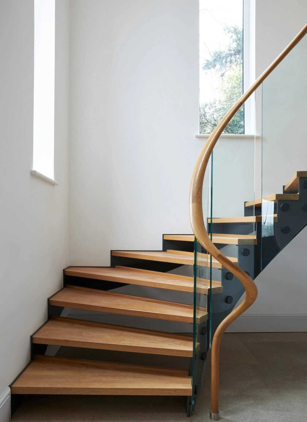 More architectural or multi-floor curved staircases featuring continuous curved handrails create a sense of movement and complexity. Even the untrained eye quickly appreciates the level of craftsmanship required for a millimetre-perfect spiralling timber handrail.