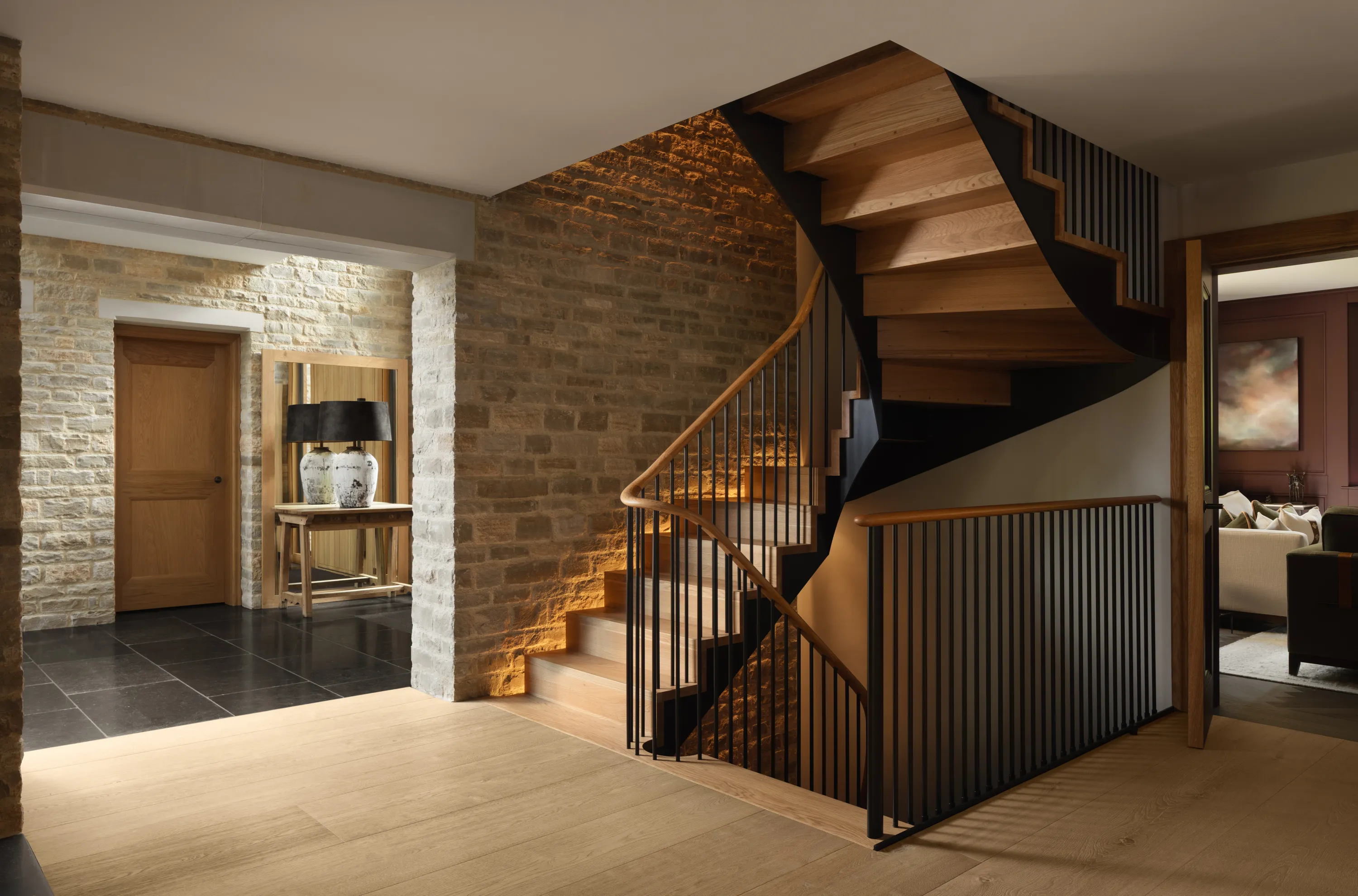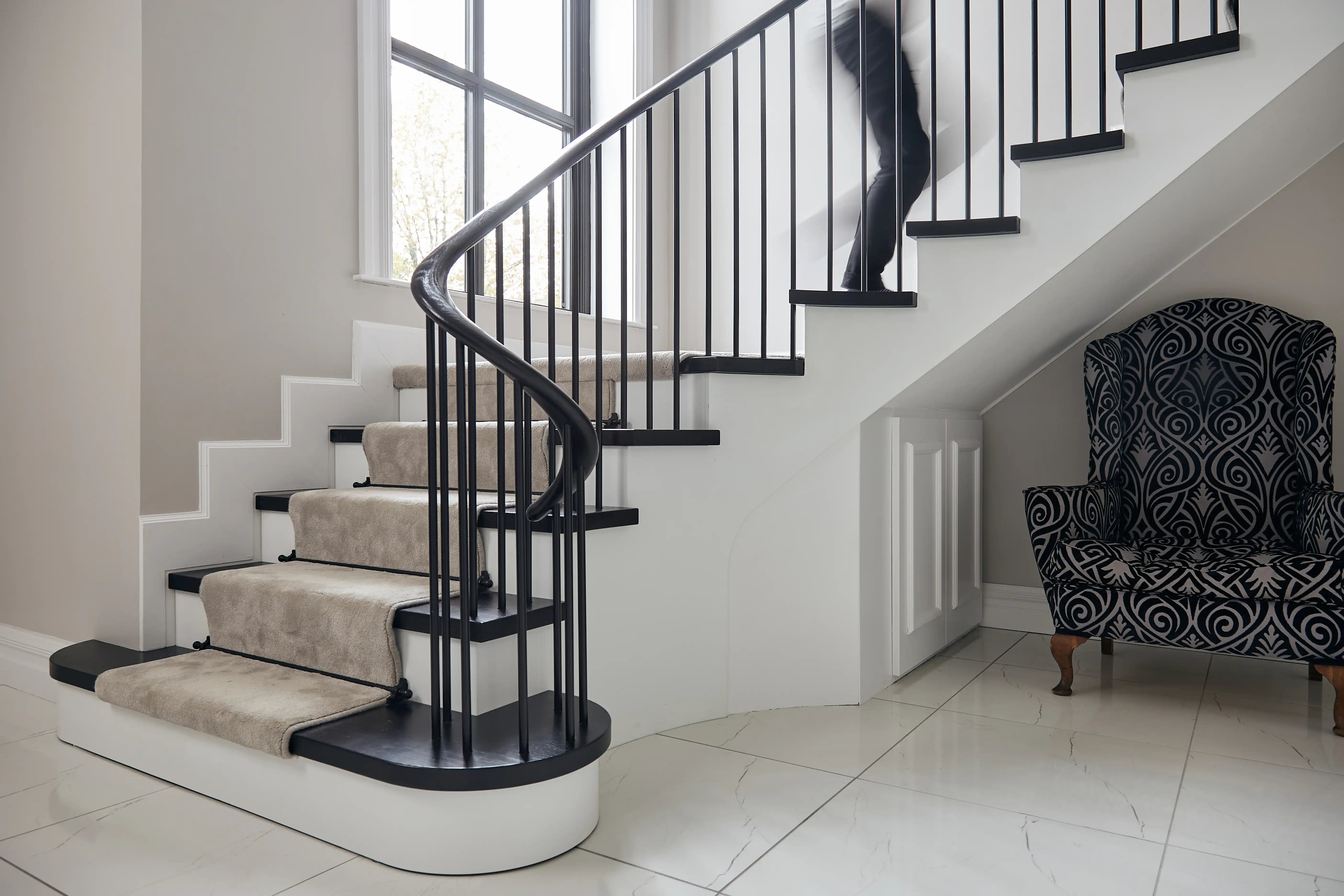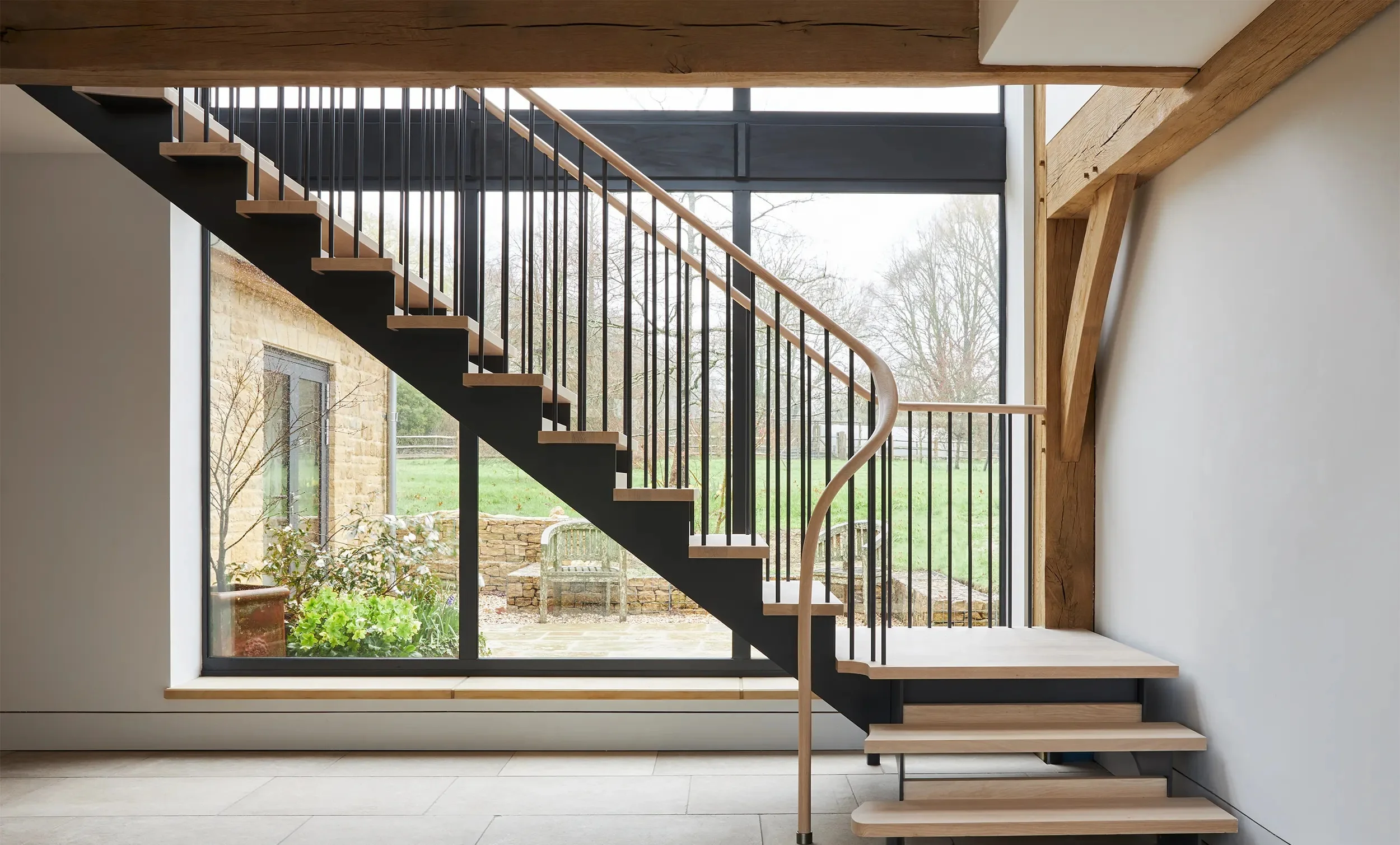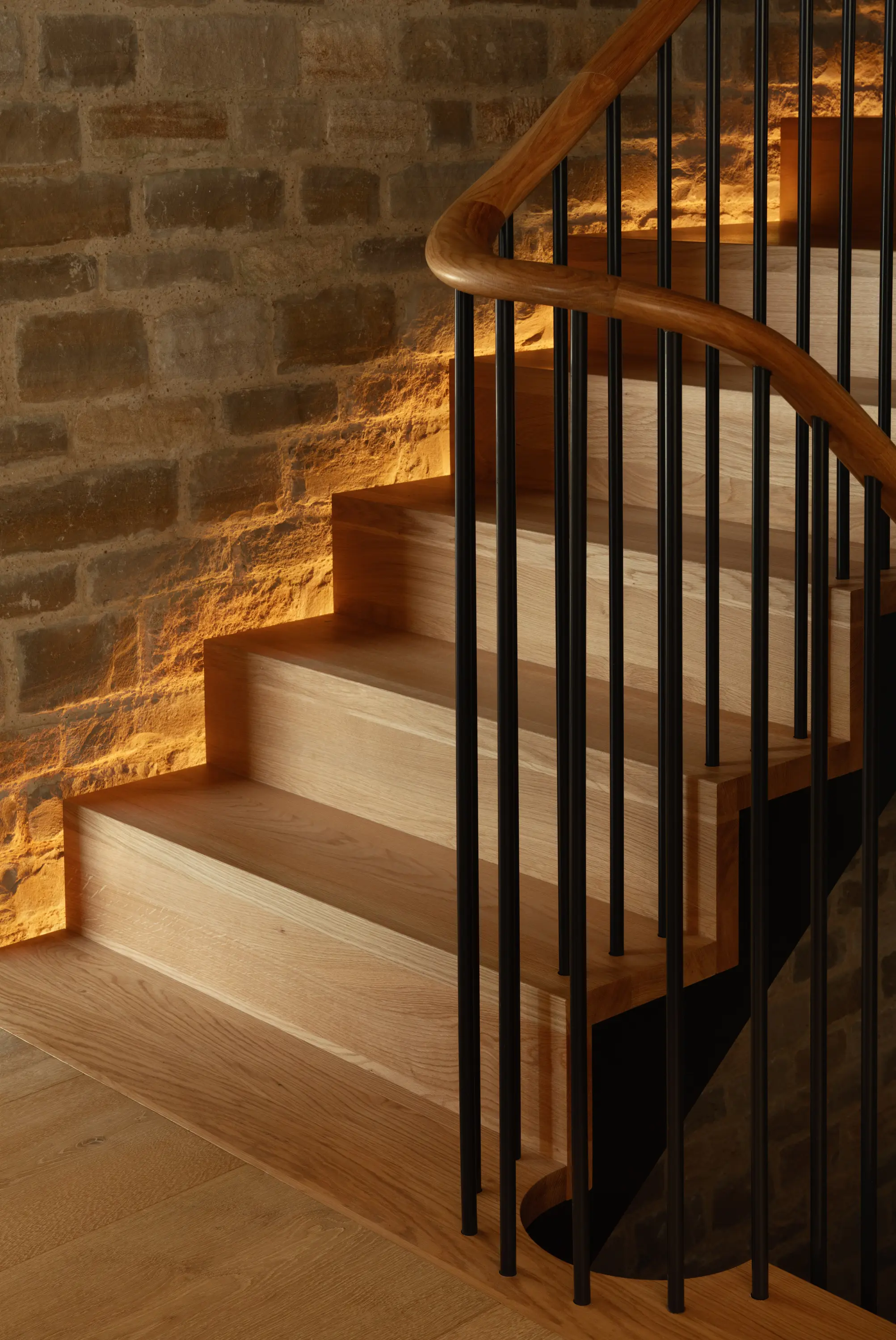 More architectural or multi-floor curved staircases featuring continuous curved handrails create a sense of movement and complexity. Even the untrained eye quickly appreciates the level of craftsmanship required for a millimetre-perfect spiralling timber handrail.