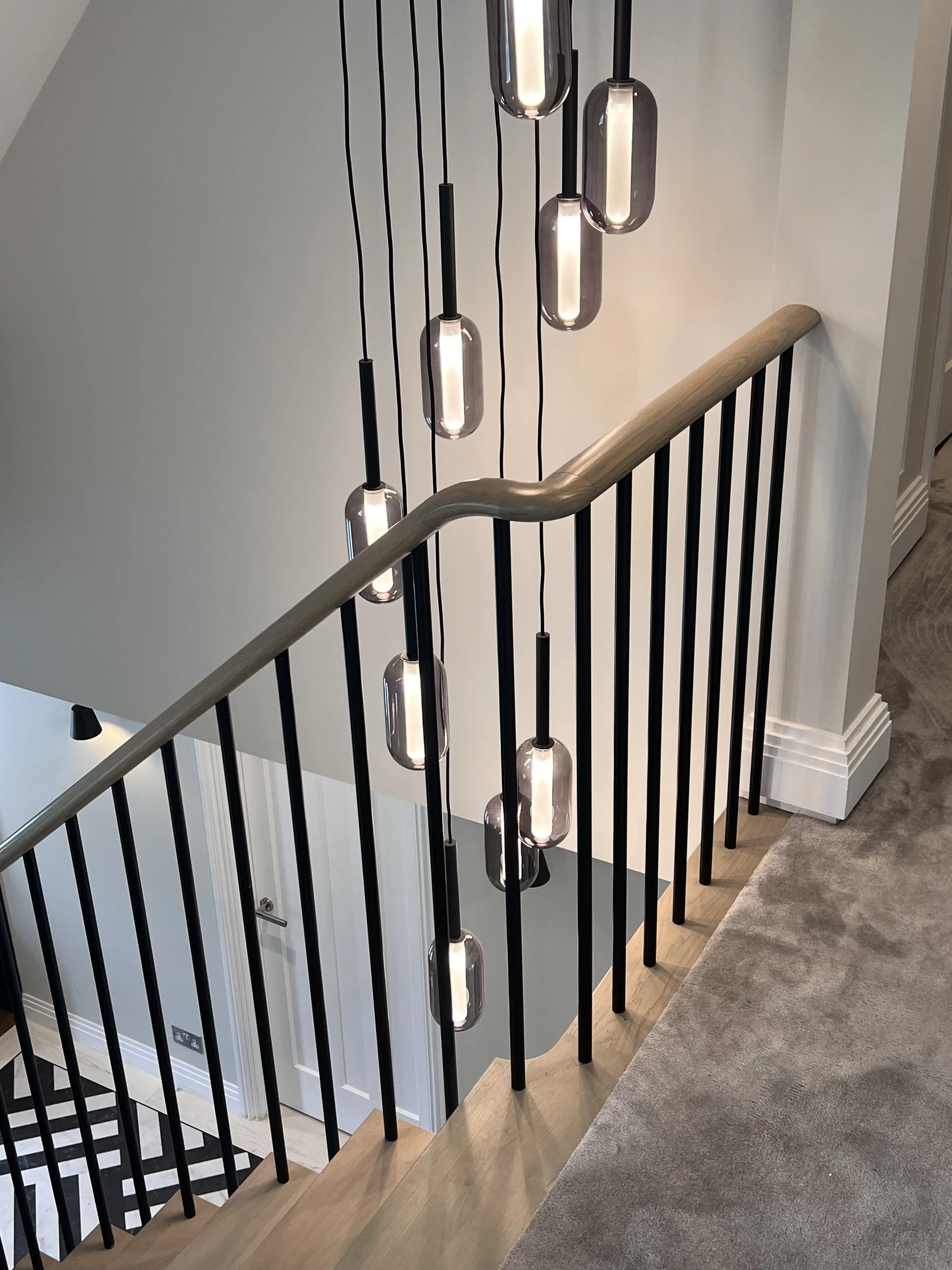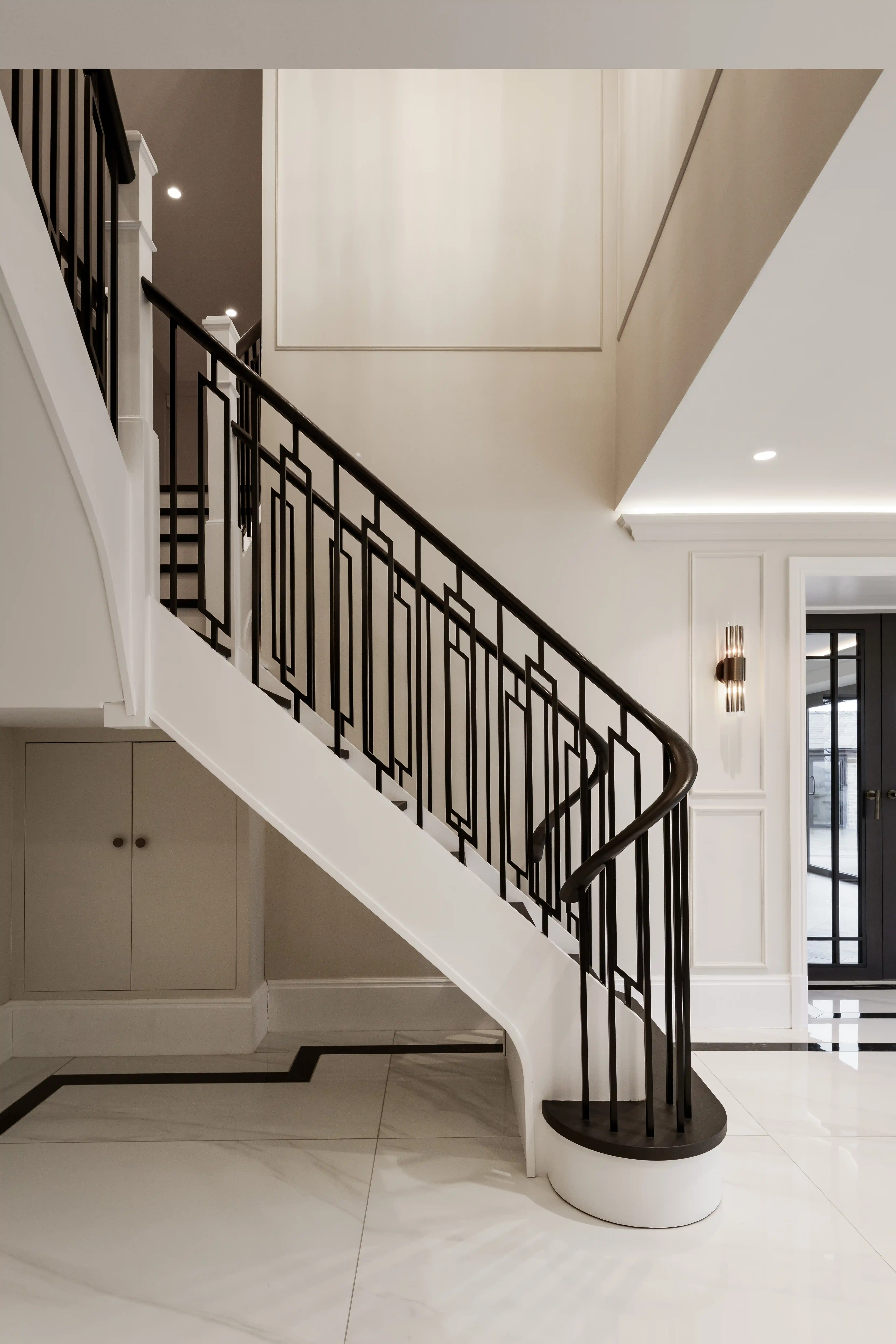 Morphing handrails are shaped so that they change form as they return to the floor or first tread. These staircases are typically highly distinctive and bring a sense of bespoke artistry, especially when the design motives are repeated in the rest of the interior.