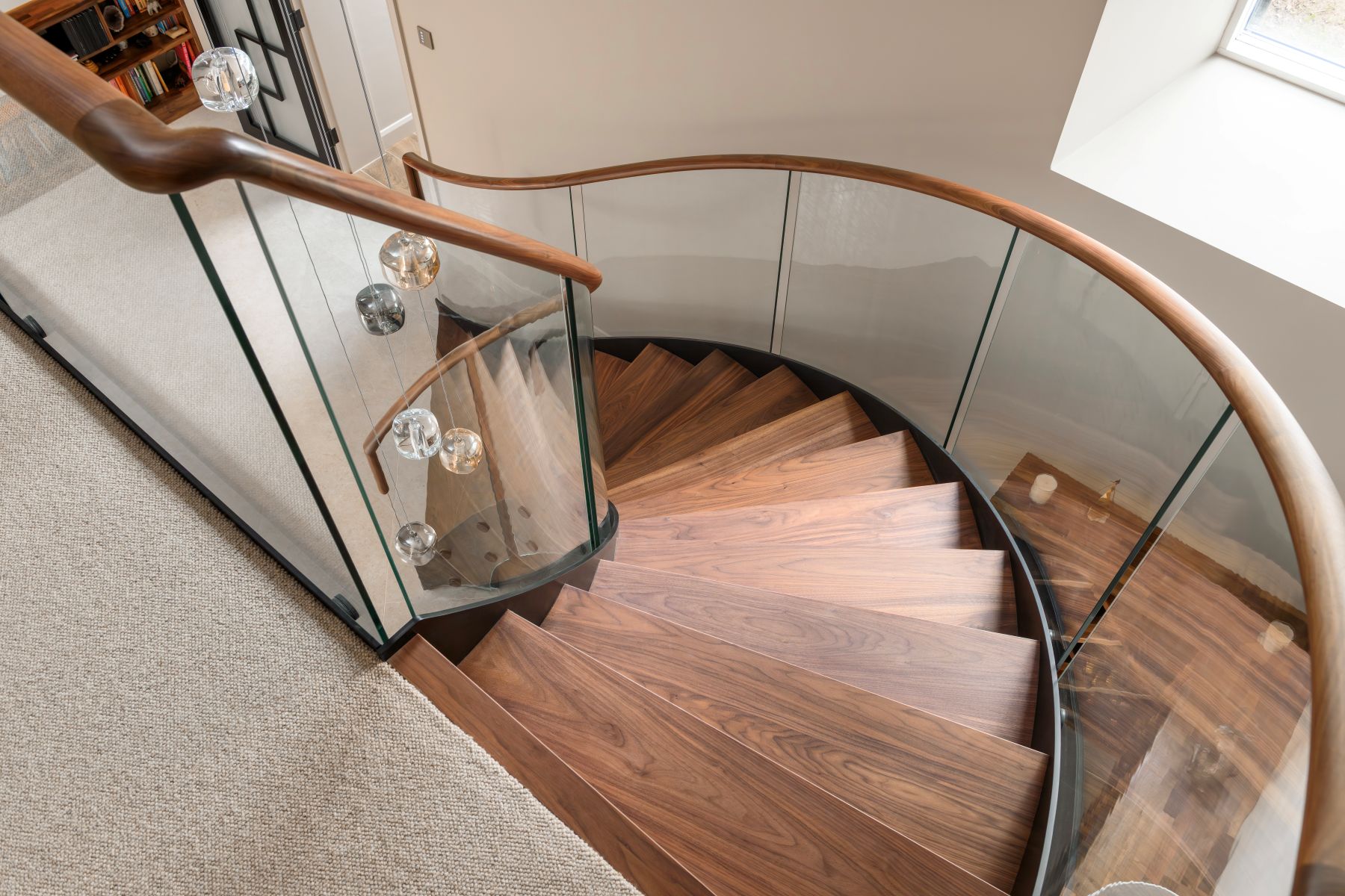 This complex helical staircase is a standout example of bespoke craftsmanship, designed to sit perfectly within the unique architecture of Hollins House. Formed from four varying radii, it flows effortlessly through the space with a bold sculptural presence.