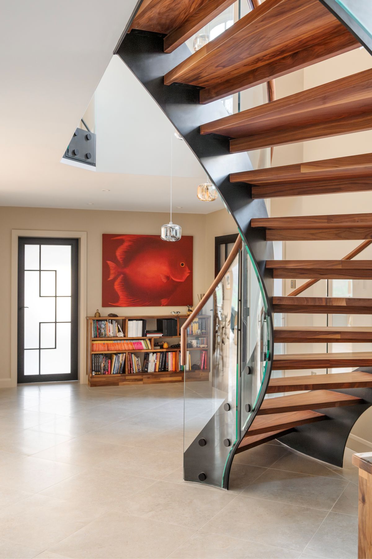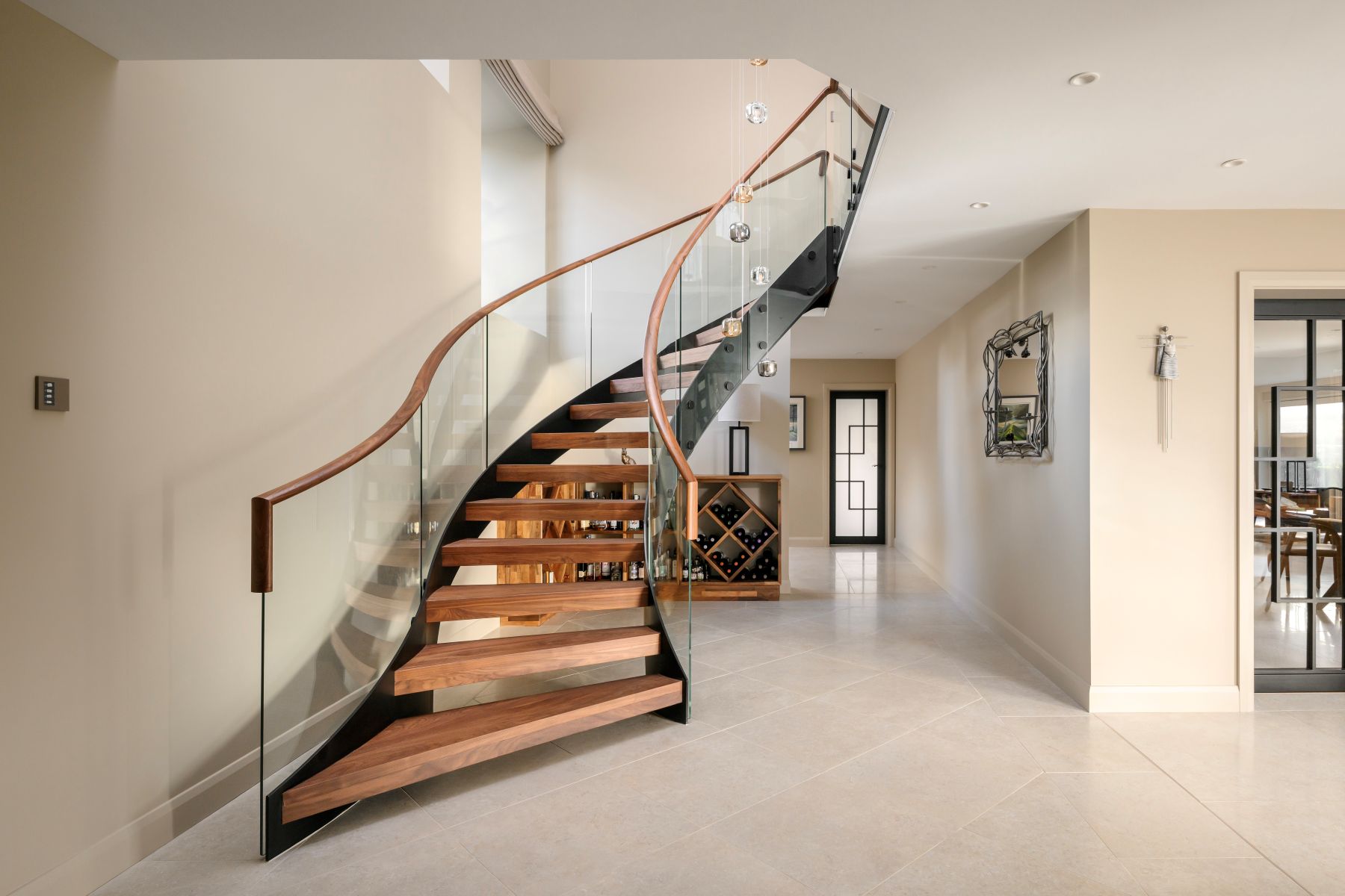 Pushing the limits of curved glass, the balustrade mirrors the staircase’s geometry with exceptional precision. A 1600mm feature tread creates a dramatic opening, setting the tone for the entire design.